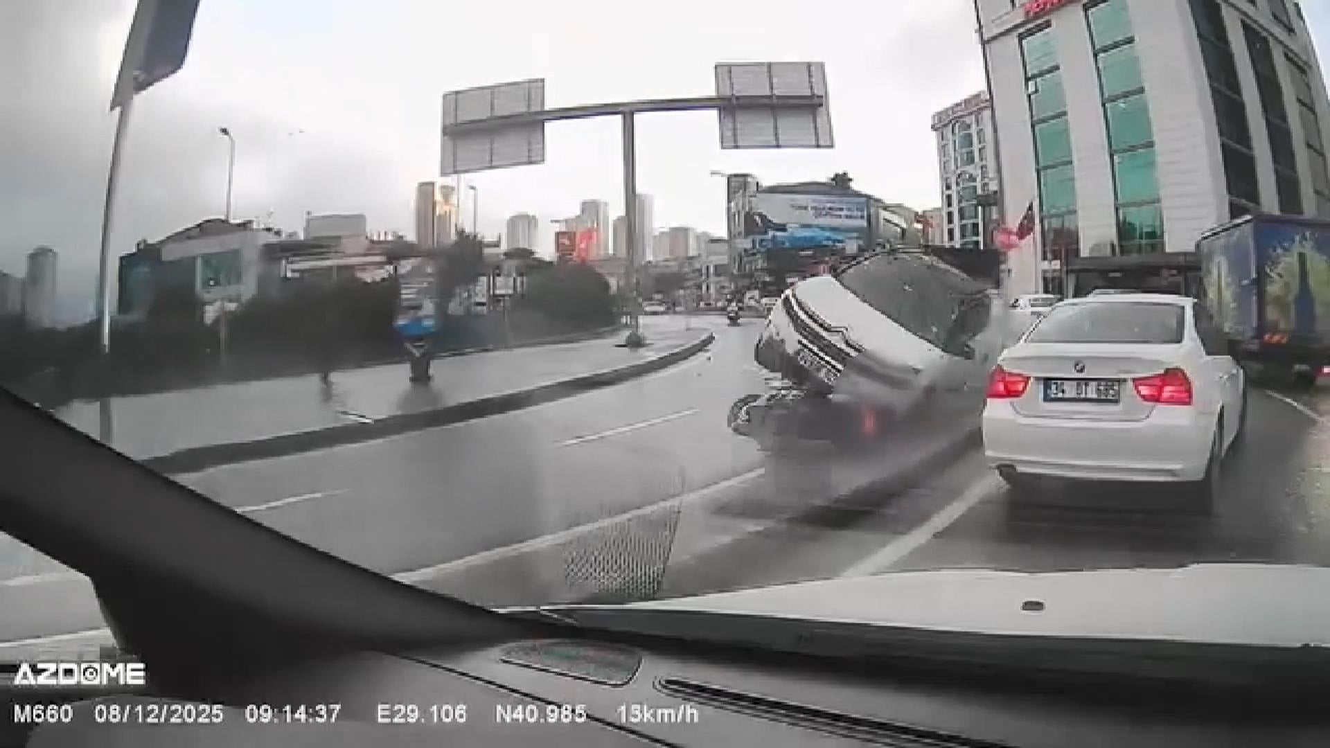 Ataşehir’de sürücüsünün direksiyon hakimiyetini kaybettiği otomobil, aynı yönde ilerleyen motosiklete arkadan çarptı. Çarpmanın etkisiyle motosiklet sürücüsü metrelerce sürüklendi, otomobil ise takla attı. Motosiklet sürücüsü otomobilin altında kalmaktan son anda kurtuldu. Korku dolu anlar, başka bir aracın kamerası tarafından saniye saniye kaydedildi.