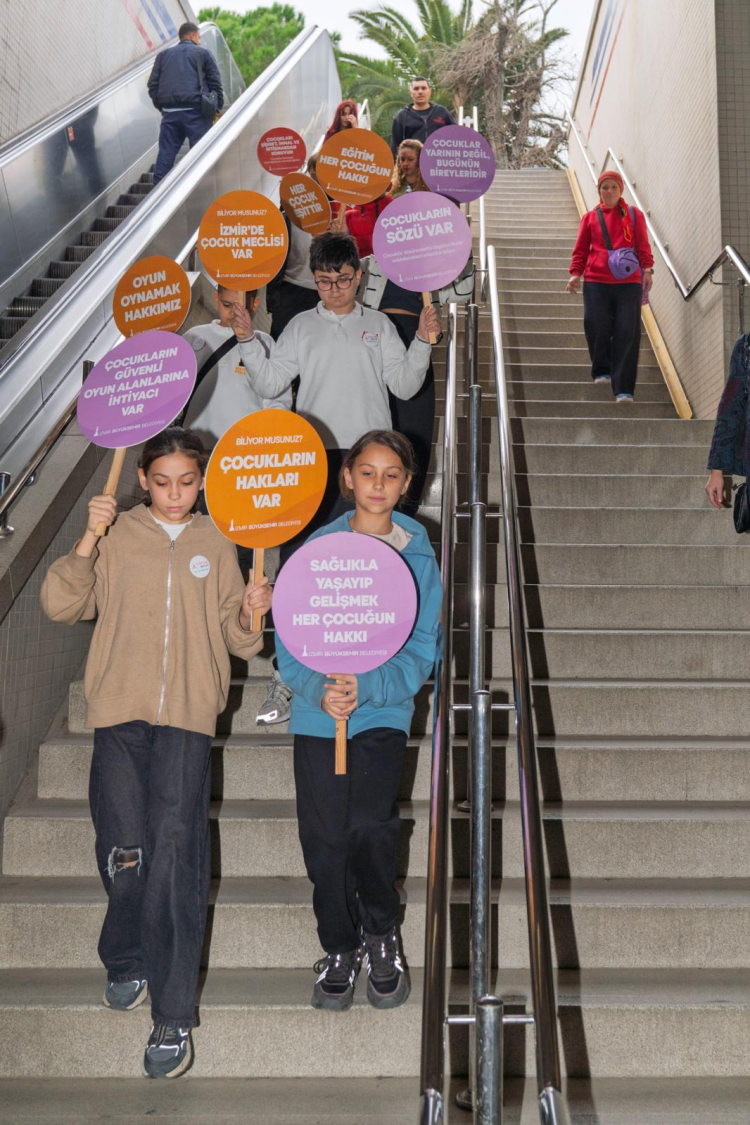 Farkındalık çalışması hakkında bilgi veren Kadın ve Aile Hizmetleri Dairesi Başkanlığı Çocuk Çalışmaları Şube Müdürlüğü Çocuk Hakları Birimi Sorumlusu Deniz Kesimler Çakal, “20 Kasım Dünya Çocuk Hakları Günü ile sebebiyle hafta boyunca çeşitli etkinliklerimiz devam ediyor. Bugün de Çocuk Meclisi üyeleriyle birlikte Çocuk Hakları Rotası etkinliği yaptık. Amacımız, toplumda çocuk haklarının görünürlüğünü sağlamak. Kentimizde yaklaşık 1 milyon çocuk yaşıyor. Bu, İzmir’de yaşayan her beş kişiden birinin çocuk olduğu anlamına geliyor. Toplumsal farkındalık, çocuk haklarının hayata geçirilmesi için oldukça önemli. Bu yüzden çocuklarla birlikte metro, tramvay ve vapurla Çocuk Hakları Rotası oluşturarak toplumda farkındalık yaratmayı amaçladık. Çocuklar haklarının farkında ve öz savunuculuk becerileri oldukça yüksek. Seslerini kendileri duyurmak istiyor. Bugün İzmir’deki yetişkinlere ‘Çocukların hakları var, İzmir’de biz de varız’ diye seslendiler” dedi.