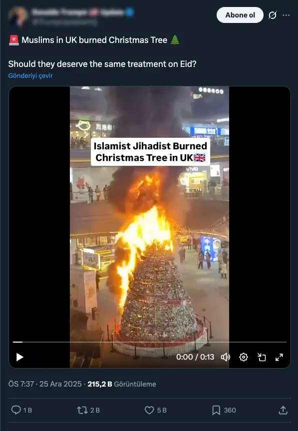 İngiltere’deki Müslümanlarla ilgili çıkan iddialı bir haber, sosyal medyada büyük yankı uyandırdı. Noel ağacının ateşe verildiğine dair görüntüler, hızla paylaşıldı ve 200 binden fazla kez görüntülendi.