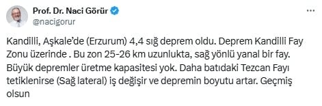 “Kandilli, Aşkale’de (Erzurum) 4,4 sığ deprem oldu. Deprem Kandilli Fay Zonu üzerinde . Bu zon 25-26 km uzunlukta, sağ yönlü yanal bir fay. Büyük depremler üretme kapasitesi yok. Daha batıdaki Tezcan Fayı tetiklenirse (Sağ lateral) iş değişir ve depremin boyutu artar. Geçmiş olsun”